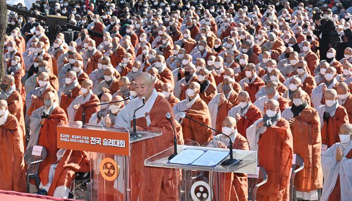 5,000 monks and nuns from all over the country gathered for the National Monastic Assembly held at Jogye-sa Temple on January 21 to sternly reprimand the Moon administration\\'s biased policies and slanders against Buddhism and resolutely uphold the sanctity of Korean Buddhism. The freezing weather that warranted cold wave warnings could not break the righteous will of the monastics to defeat evil and defend true Dharma.